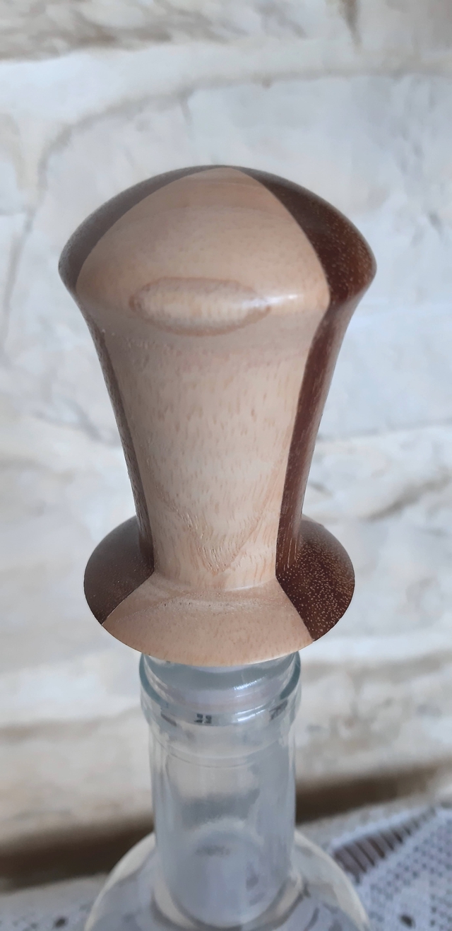 Bouchon en frêne et acajou, embout en silicone amovible pour le nettoyage, adaptable à toutes bouteilles hors champagne. Eviter le réfrigérateur le bois n'aime pas les changements de température. Dimension : 8.5 cm de long, 4 cm de diamètre en haut