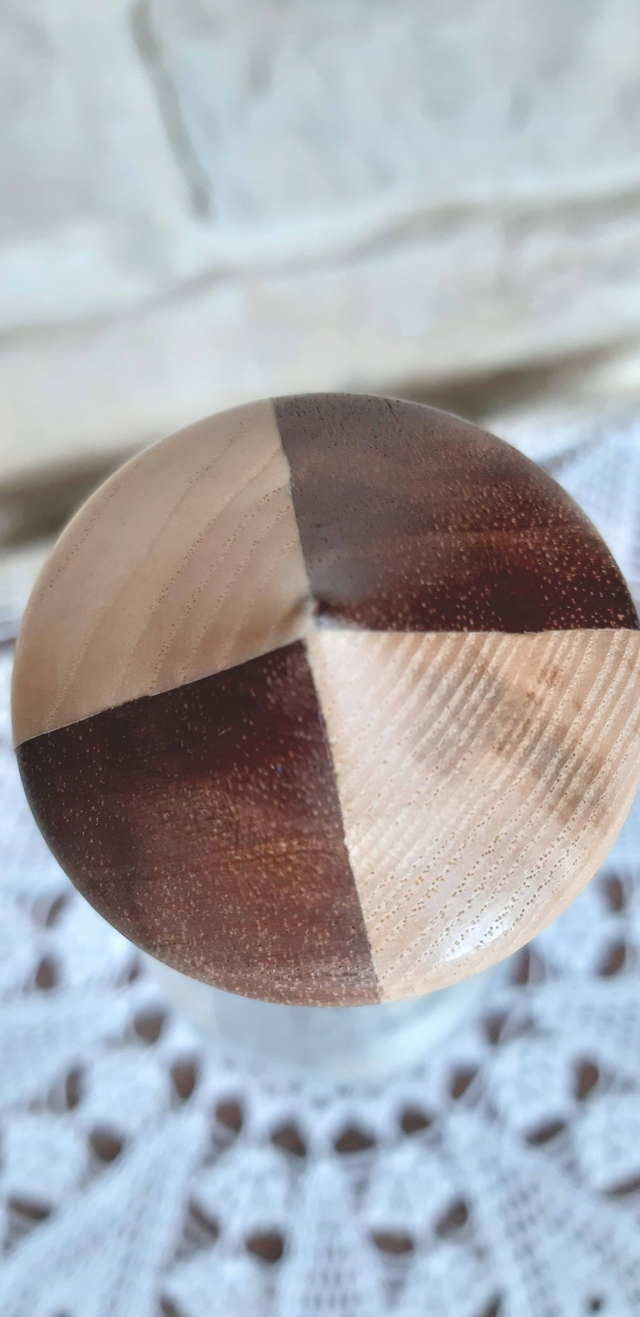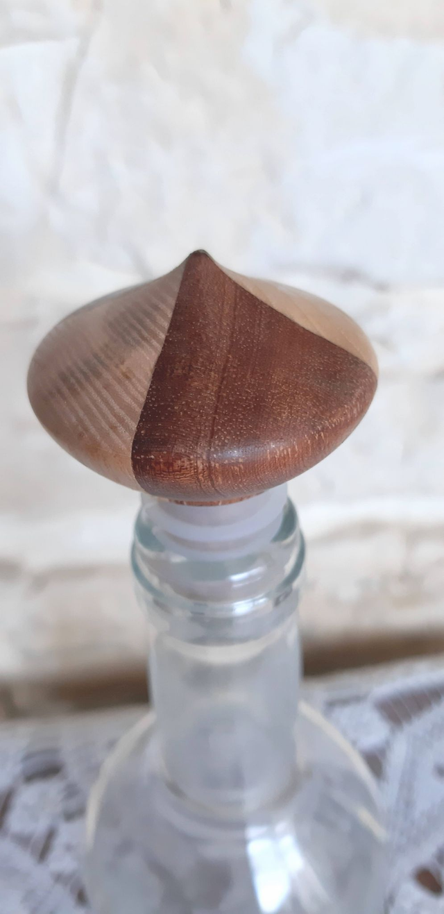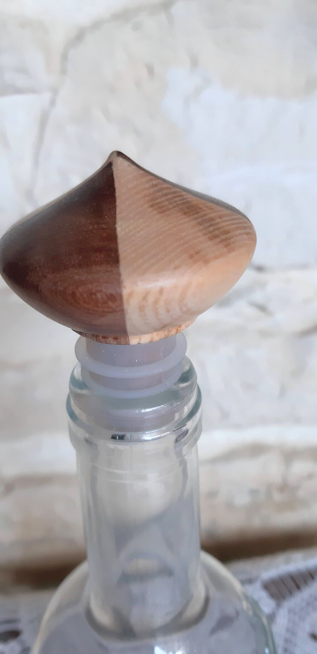 Bouchon bicolore en frêne et acajou, embout en silicone amovible pour le nettoyage. Eviter le réfrigérateur le bois n'aime pas les changements de température. Dimension : 6 cm de long, 4.5 cm de diamètre au plus large