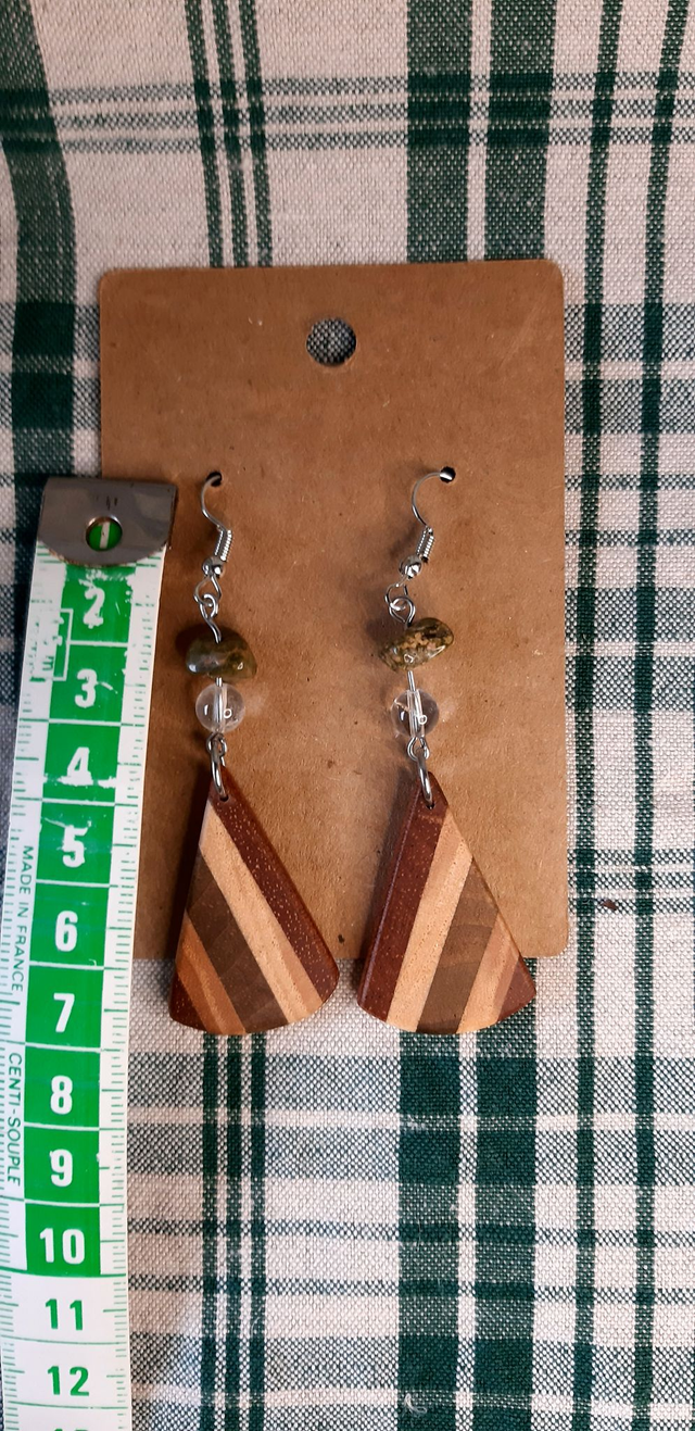 L'alliance de la beauté du bois et des pierres naturelles une évidence !! Pièce unique entièrement fabriquée par mes soins. Ici vous trouverez plusieurs bois : Sipo, noyer et frêne ornés de cristal de roche et Unakite le tout monté sur acier chirurgical.
