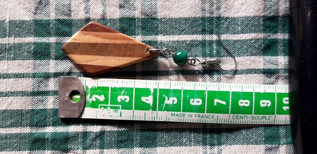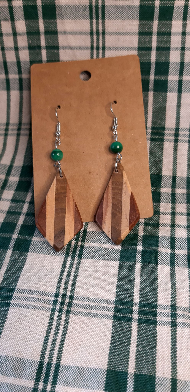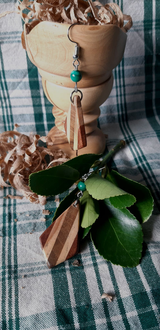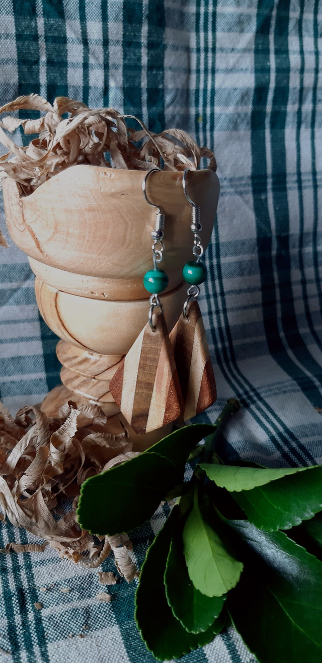Boucles d'oreilles en bois : Sipo, noyer et frêne accompagnés par une perle naturelle de Malachite le tout monté sur des apprêts en acier chirurgical.