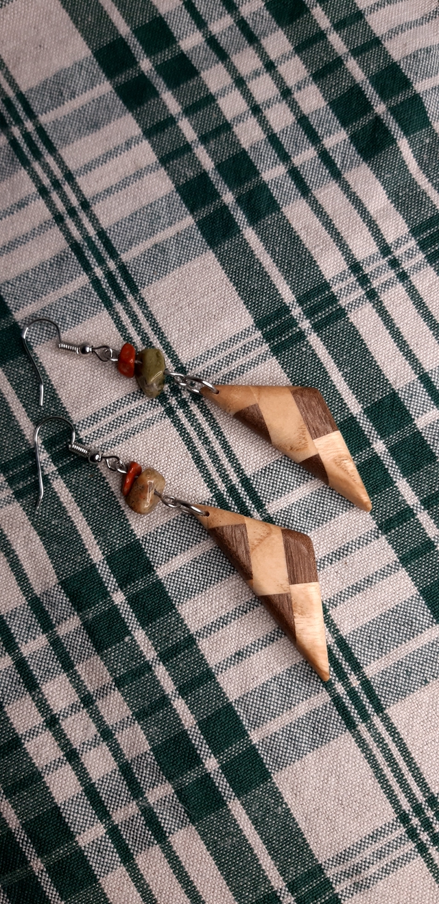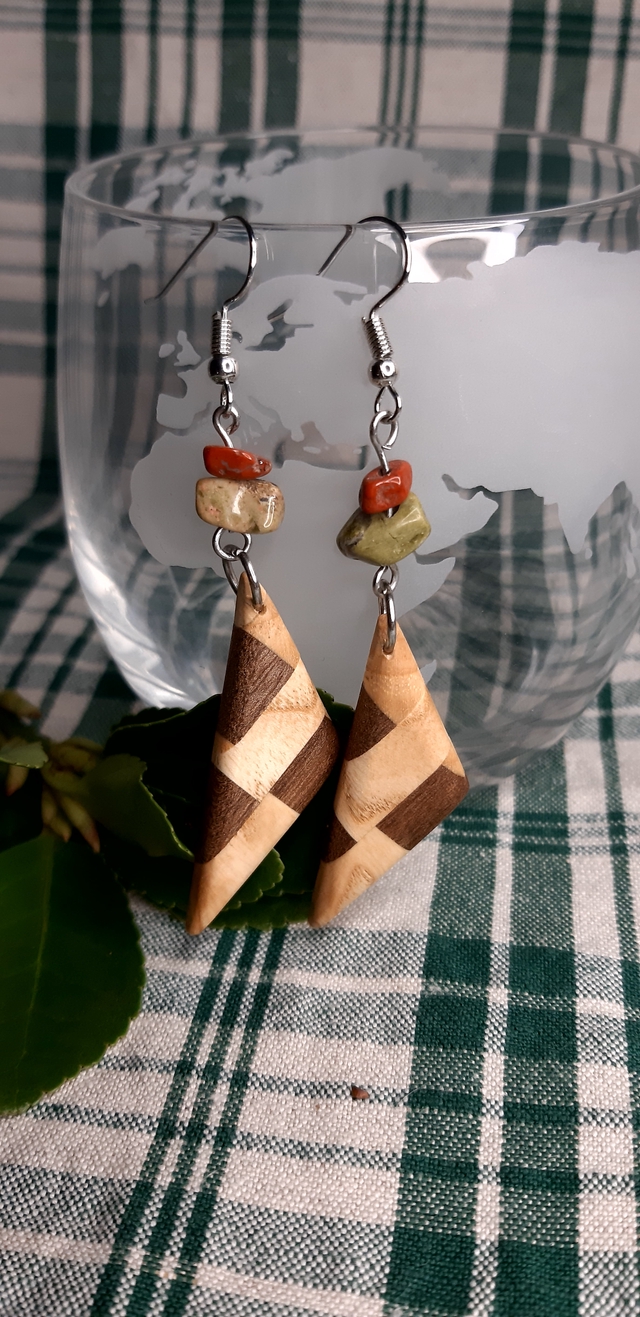 Boucles d'oreilles en forme de voile composées d'un assemblage de morceaux de noyer et de frêne assemblés puis redécoupés. Finition cire d'abeilles naturelle. Le bois est surmonté de chips d'Unakite et de Jaspe rouge. Longueur : 6 cm. Pièces unique entièrement imaginées et fabriquées à la main dans mon atelier.