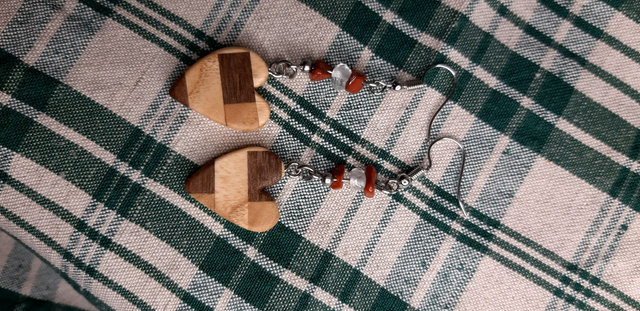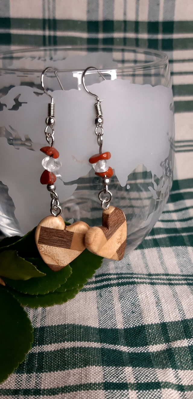 Boucles d'oreilles "Petits cœurs de travers". Les coeurs en bois sont découpés dans un assemblage de frêne et de noyer, réhaussés en couleur par la Jaspe rouge et en éclat par le cristal de roche. La finition du bois est cire d'abeilles naturelles. Le tout est monté sur acier chirurgical. Pièces uniques entièrement pensées et réalisées à la main dans mon atelier. Longueur : 5 cm, largeur du coeur : 1.5 cm.