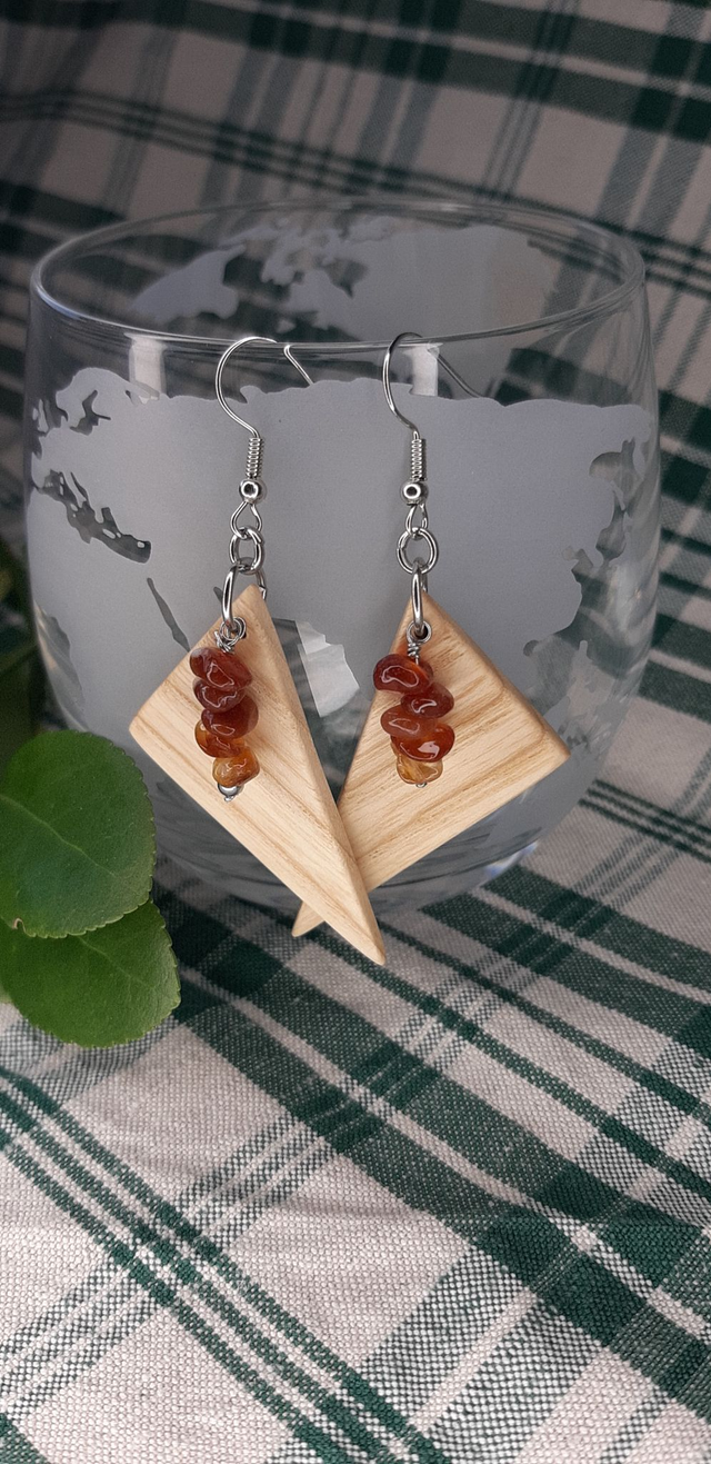 Boucles d'oreilles en bois de frêne éco-responsable, ce triangle est agrémenté d'Aventurines pierres naturelles. Le tout est monté sur de l'acier inoxydable. Comme toutes mes créations elles sont entièrement imaginées et conçues dans mon atelier. Longueur : 4.5 cm au plus large : 2 cm.