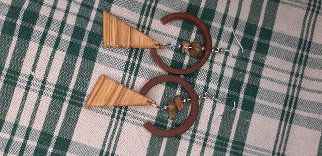 Boucles d'oreilles composées de triangles en bois d'olivier et d'un demi-cercle en Sipo, des pierres d'Unakite naturelle subliment les essences de bois. Le tout est monté sur des apprêts en acier inoxydable. Longueur : 6.5 cm, diamètre des demi anneaux : 3 cm.