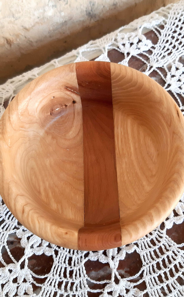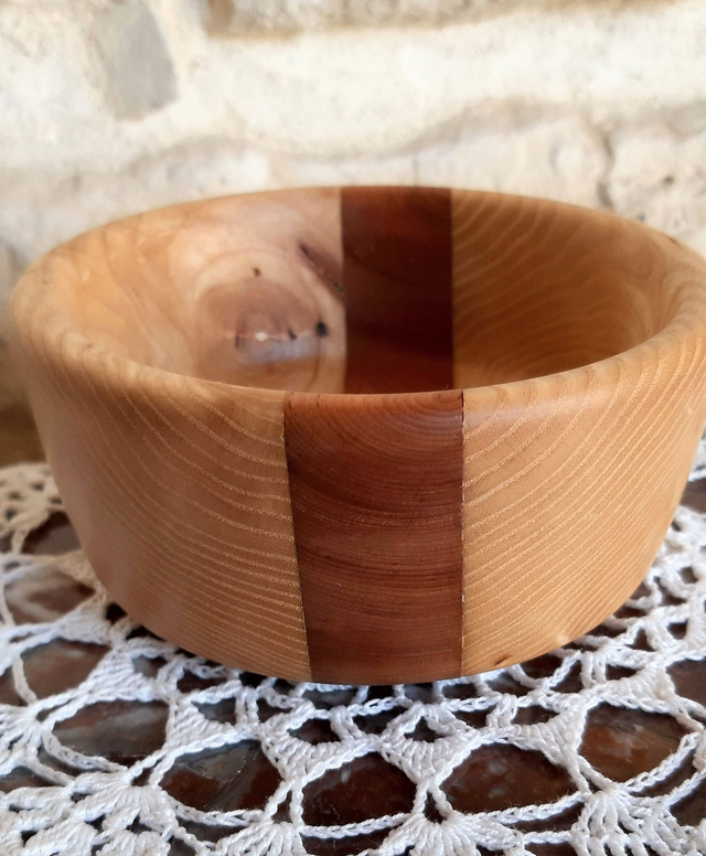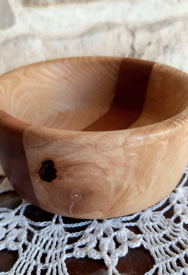 Coupelle bicolore en frêne et merisier pour présenter vos biscuits apéritifs ou tout autre aliments secs. La couleur miel du frêne et le rouge du merisier aiguaieront votre table. Finition huile alimentaire. Dimensions : diamètre au plus large : 12 cm, profondeur : 3.5 cm hauteur : 5.5
