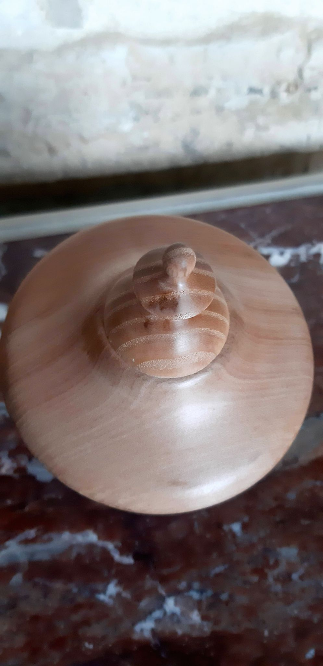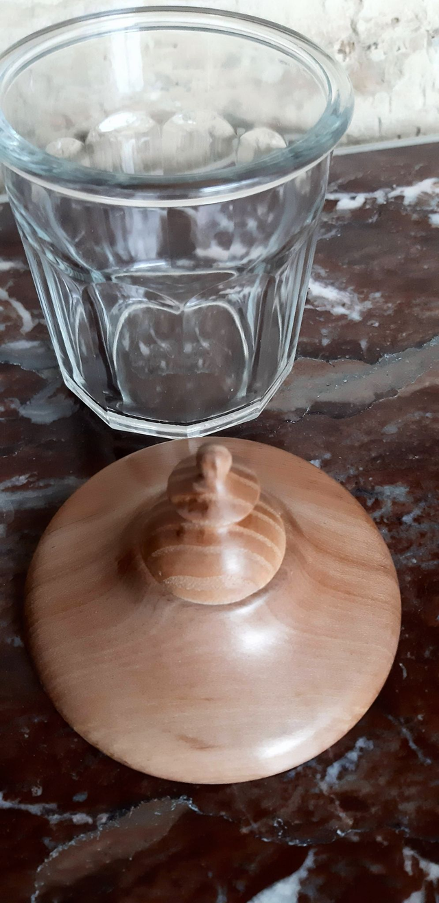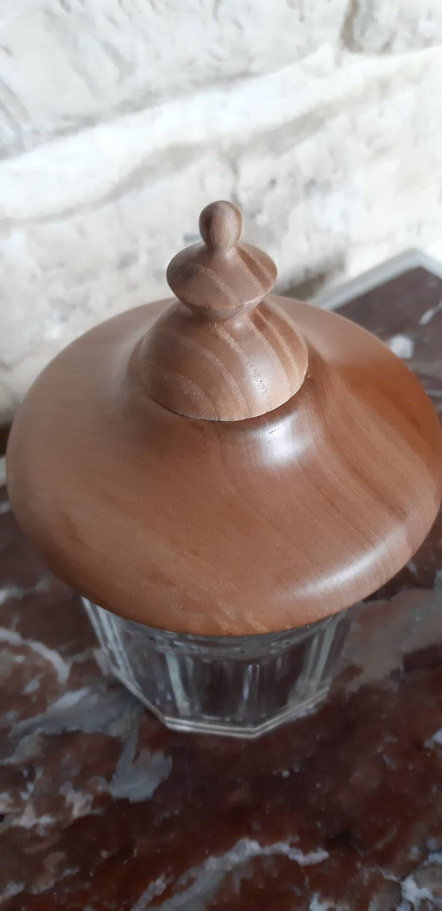 Pot à confiture vintage en verre et son couvercle en merisier fabriqué au tour à bois. Dimensions : pot diamètre 9.5 cm couvercle : 10 cm hauteur : 16 cm