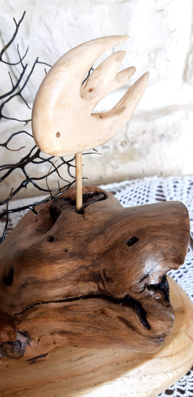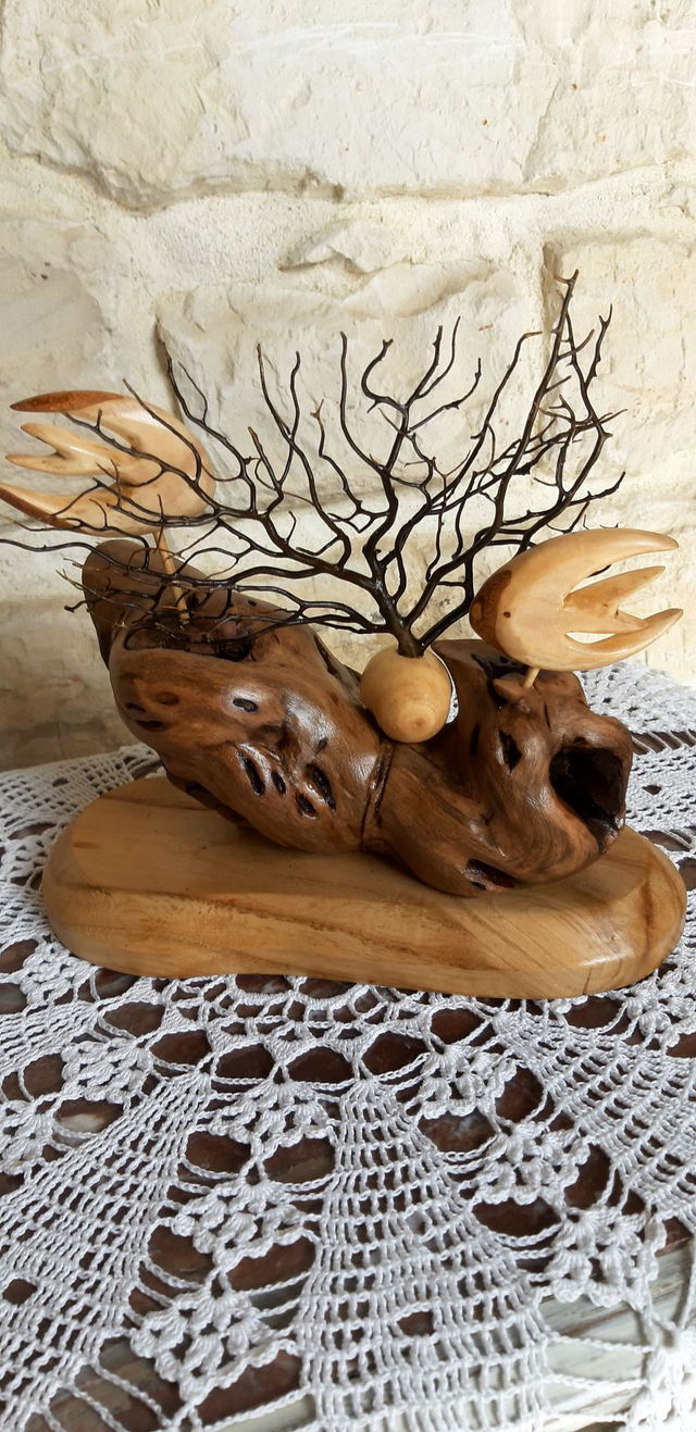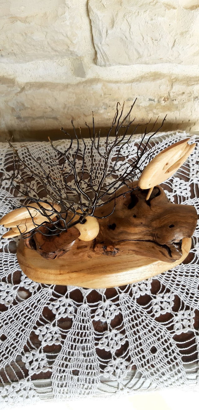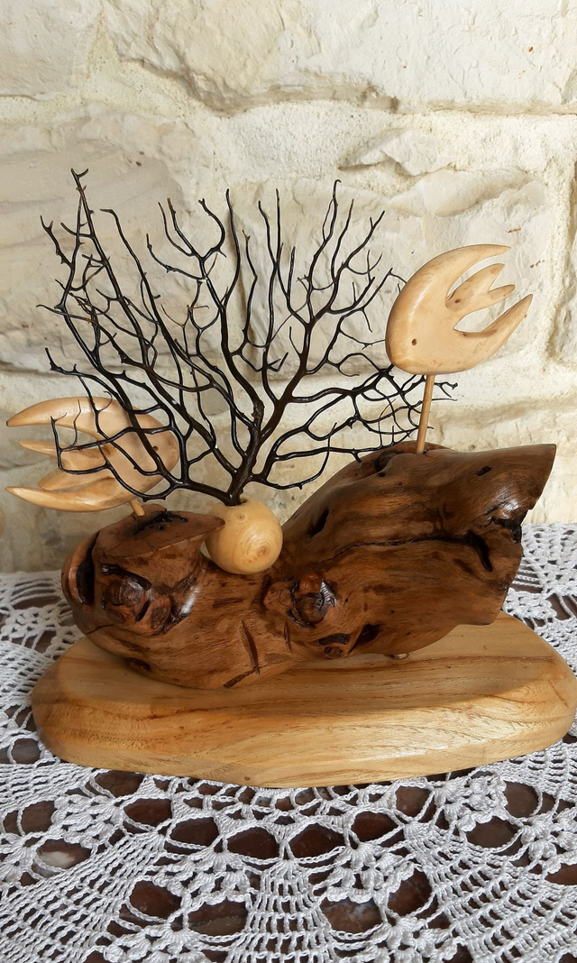 Scène marine, composée de poisson en bouleau, le socle en frêne ainsi qu'un morceau de cep de vigne du Médoc. Une gorgone, corail mort récupéré dans les filets des pêcheurs du port de La Rochelle. Pièce unique. Finition vernis satiné. Dimensions : 23 cm de long, 20 cm de haut et 11 cm de large