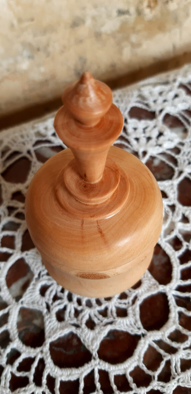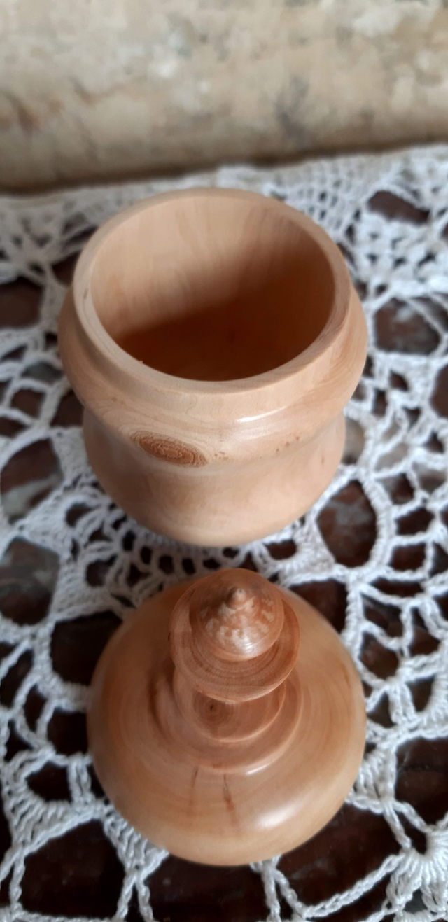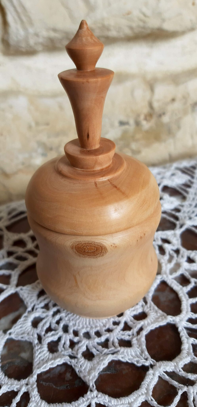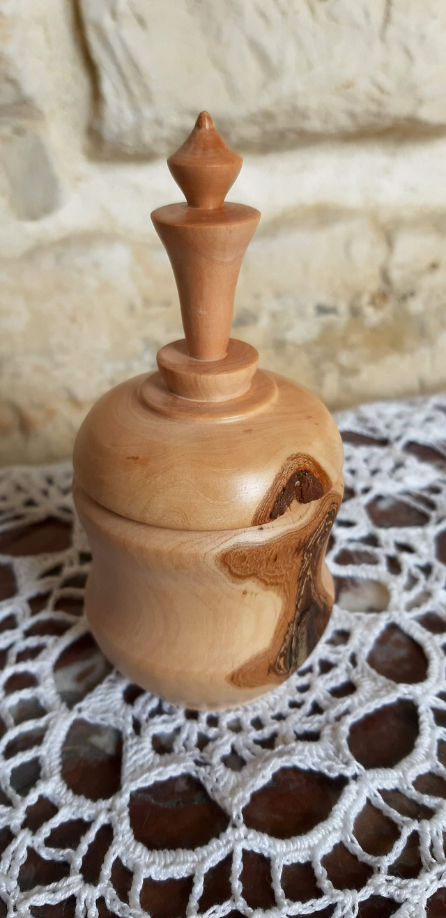 Boite miniature en olivier, petite section de taille saisonnière cachait cette jolie petite boite avec un reste d'écorce sur son pourtour afin de lui laisser ce petit coté sauvage. Finition lustrée à la cire de Candelilla. Dimensions : diamètre au plus large : 5 cm, profondeur : 3.5 cm, hauteur : 11 cm