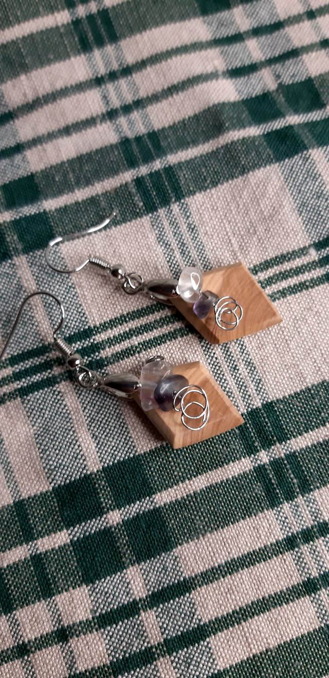 Boucles d'oreilles petits losanges en bois de Lilas, agrémentés de cristal de roche et Fluorine montés sur un fil d'acier inoxydable joliment enroulé. Finition cire d'abeilles naturelle, montés sur acier chirurgical. Longueur : 2.5 cm. Pièces uniques entièrement imaginées et fabriquées à la main dans mon atelier.