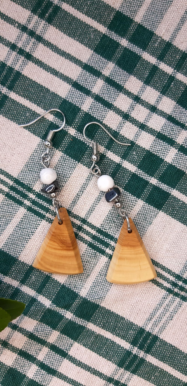 Boucles d'oreilles composées d'un petit triangle biseauté en Lilas surmonté d'une pierre d'Hématite et d'une perle de Howlite blanche. Le tout est monté sur de l'acier inoxydable. Le bois est ciré à la cire d'abeilles naturelle et lustré. Toutes mes créations sont entièrement imaginées et façonnées dans mon atelier.