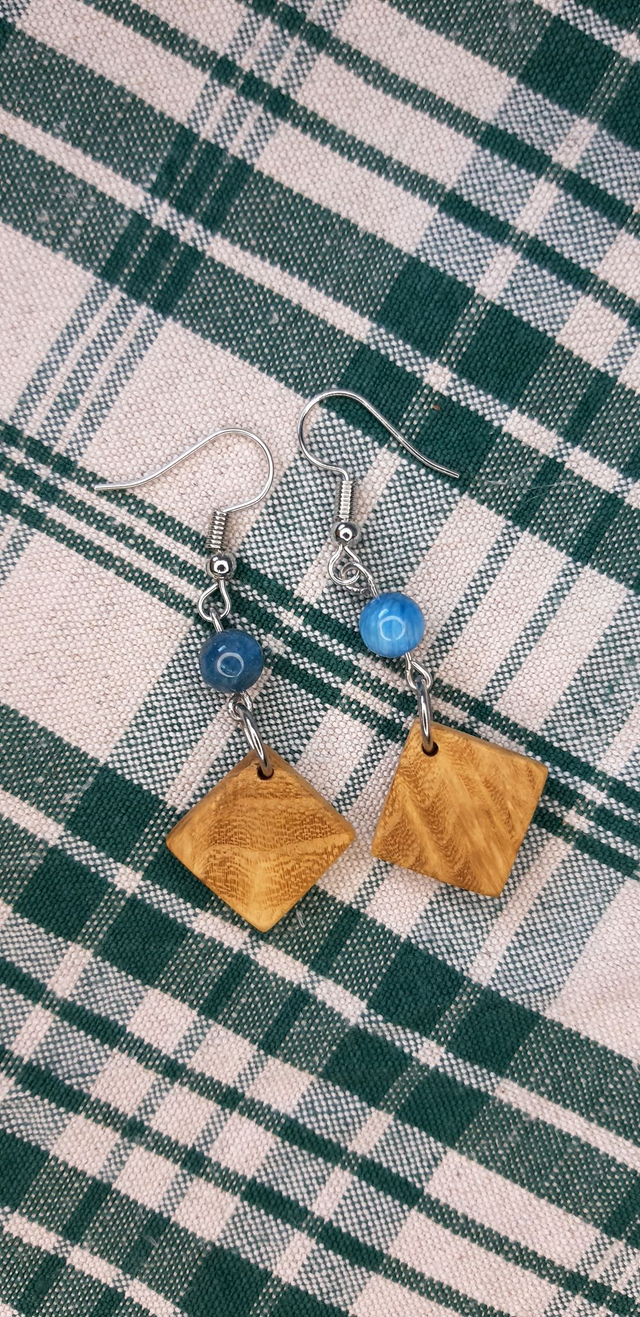 Boucles d'oreilles composées d'un petit carré joliment veiné d'acacia, sa teinte dorée naturelle se marie avec la perle d'Apatite bleue qui le surmonte. Vraiment discrètes puisqu'elles ne mesurent que 3 cm de long sur 1.5 cm de large sur la diagonale du carré. Le tout est monté sur de l'acier inoxydable. Je n'utilise que du bois local éco-responsable issu de tailles saisonnières ou de chutes de menuiseries.