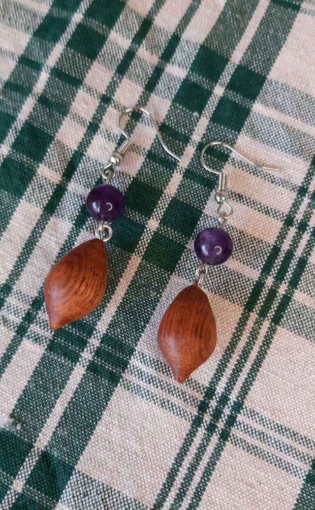 Boucles d'oreilles bois et pierres naturelles, pièces uniques fabriquées à la main à l'atelier. Perle en bois de Sipo façonnées au tour à bois finition cire d'abeilles. Perles d'Améthystes le tout monté sur apprêts en acier chirurgical. Longueur : 4 cm.
