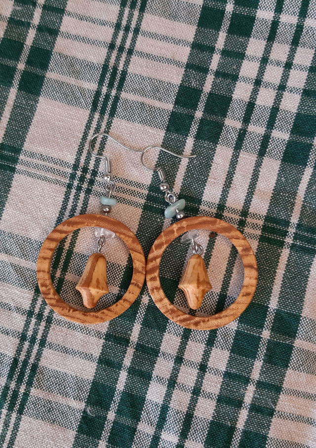 Créoles en bois et pierres naturelles, anneaux en orme de 3 cm de diamètre ornés de cristal de roche et amazonite, perle au centre en orme fabriquée